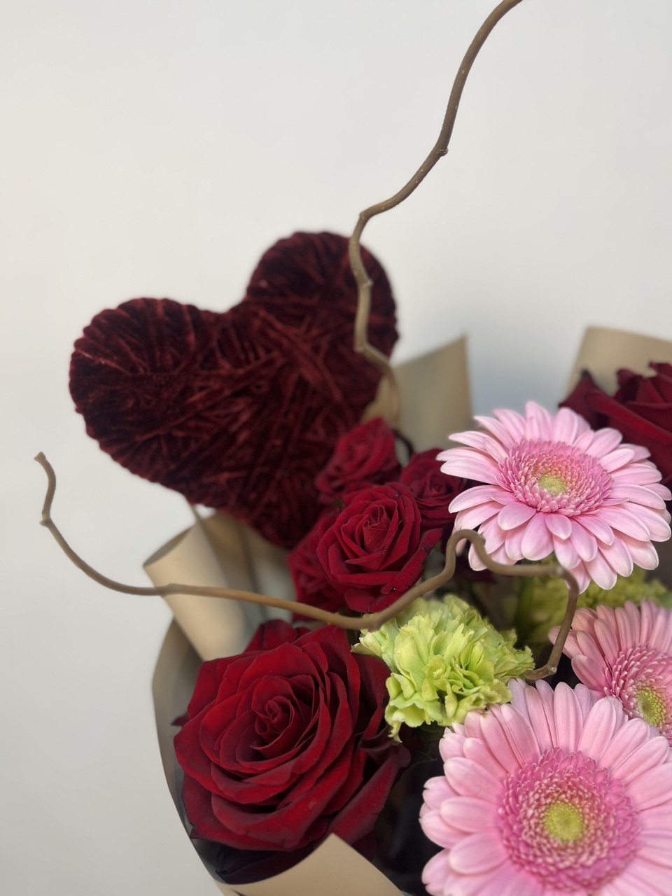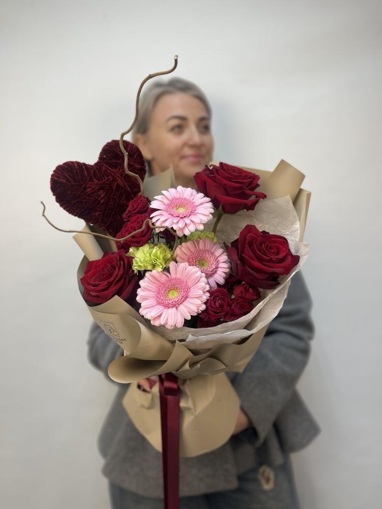 РОЗА Эквадор "Эксплоурер" 3шт, гермини 3шт, диантус 2шт, кустовая роза 2шт, корелиус 2 ветки, декор сердце 1шт