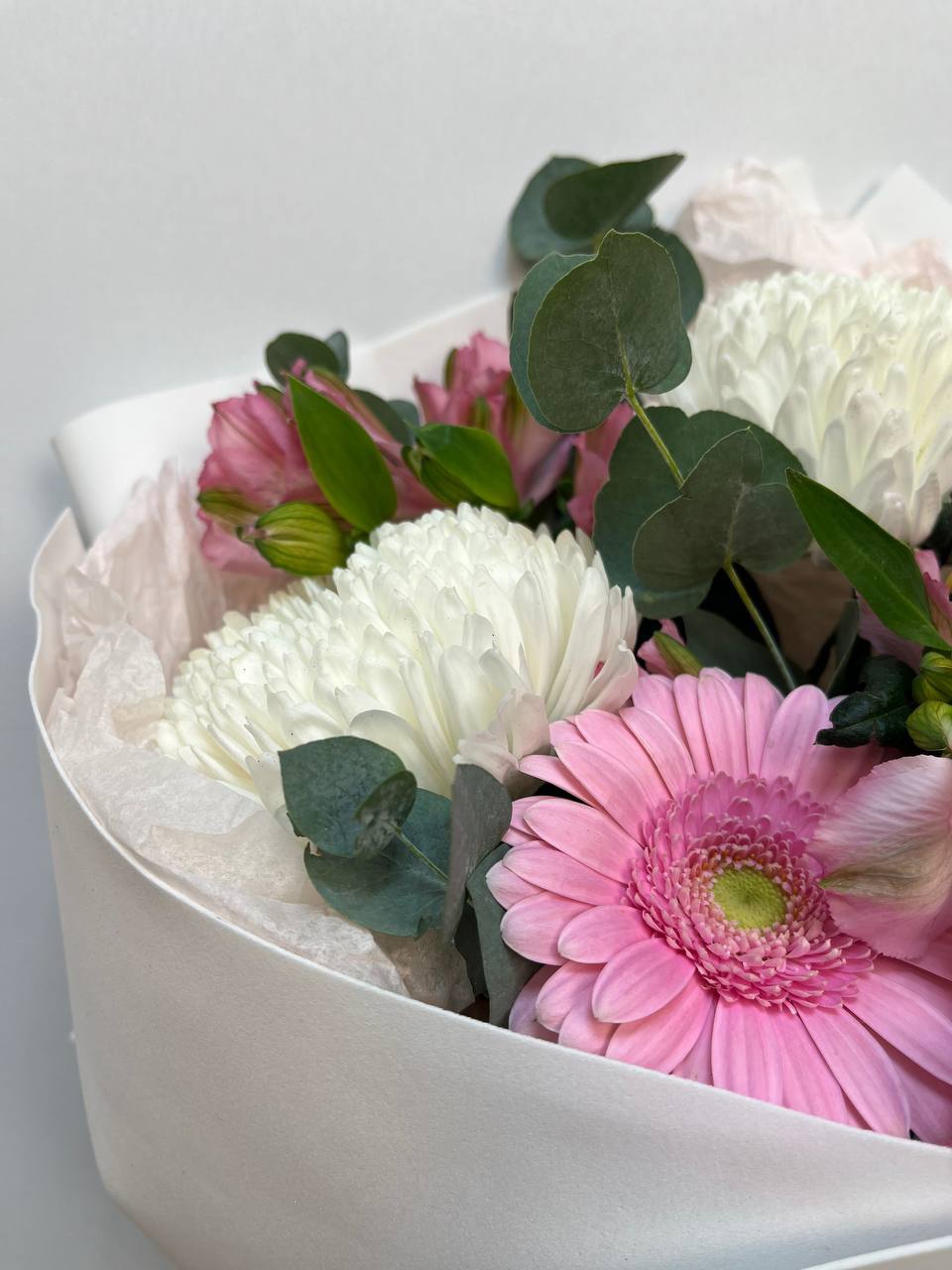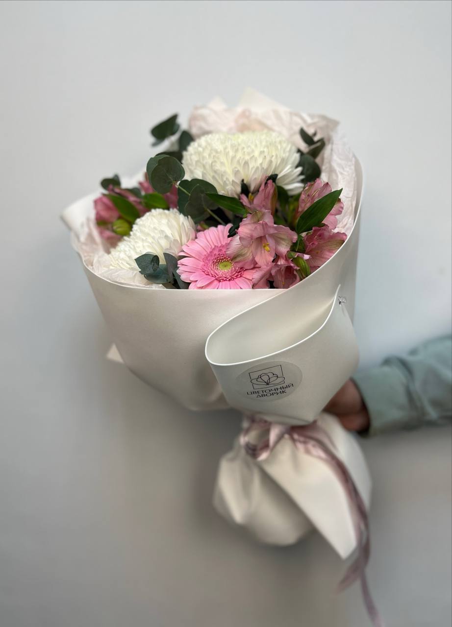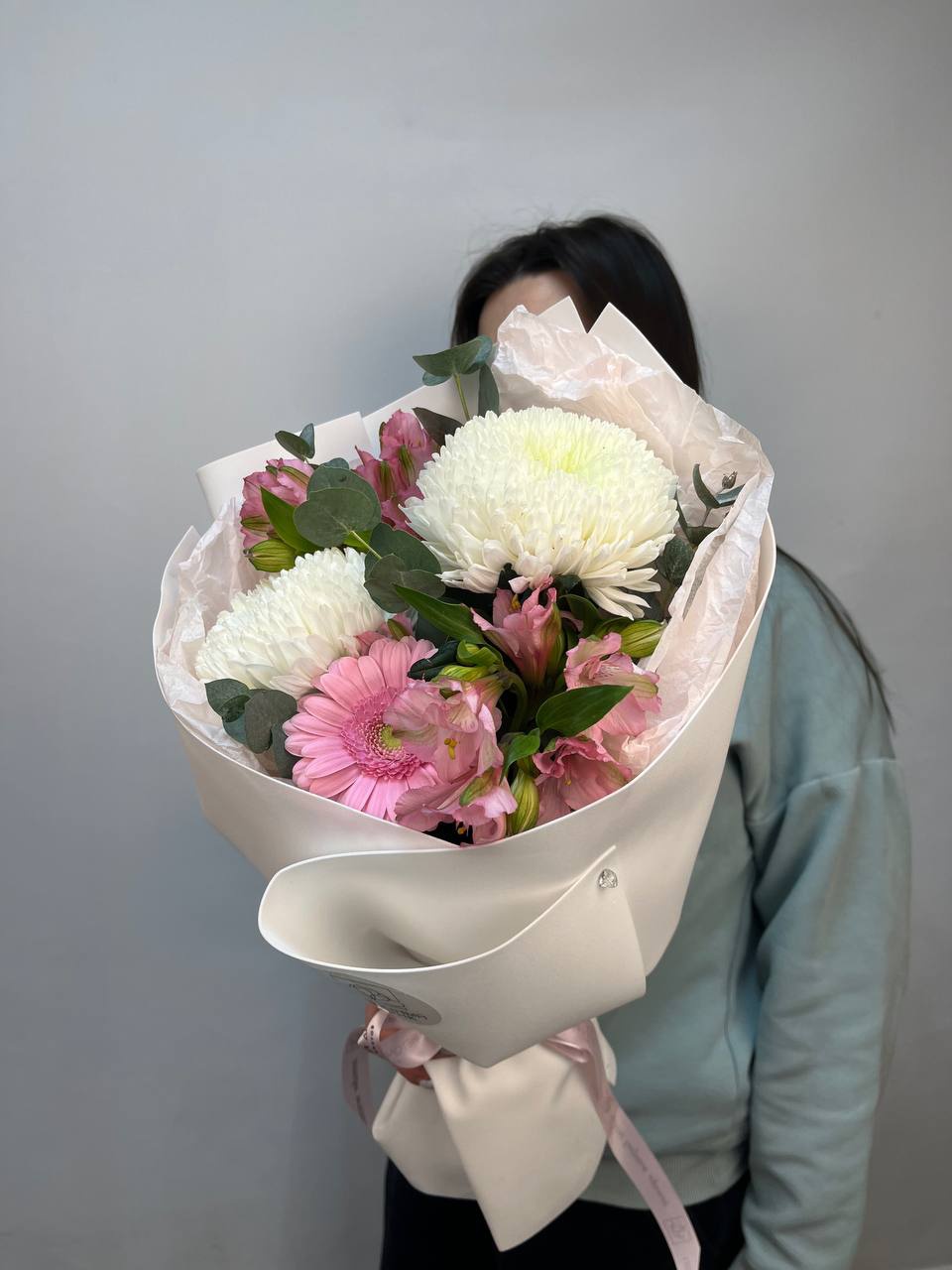 Хризантема одноголловая Антонов 2шт, гермини розовая 1шт, альстромерия розовая 1шт