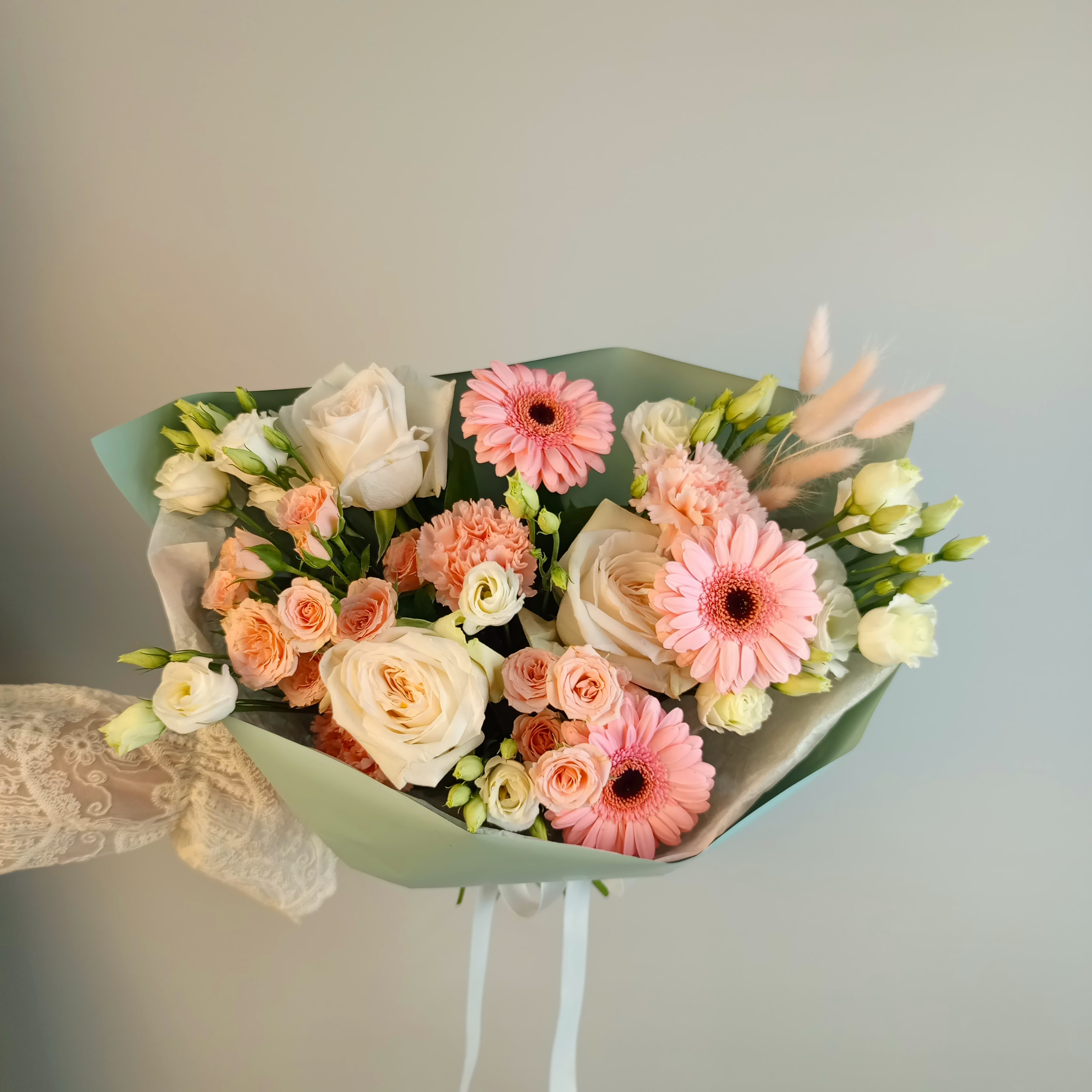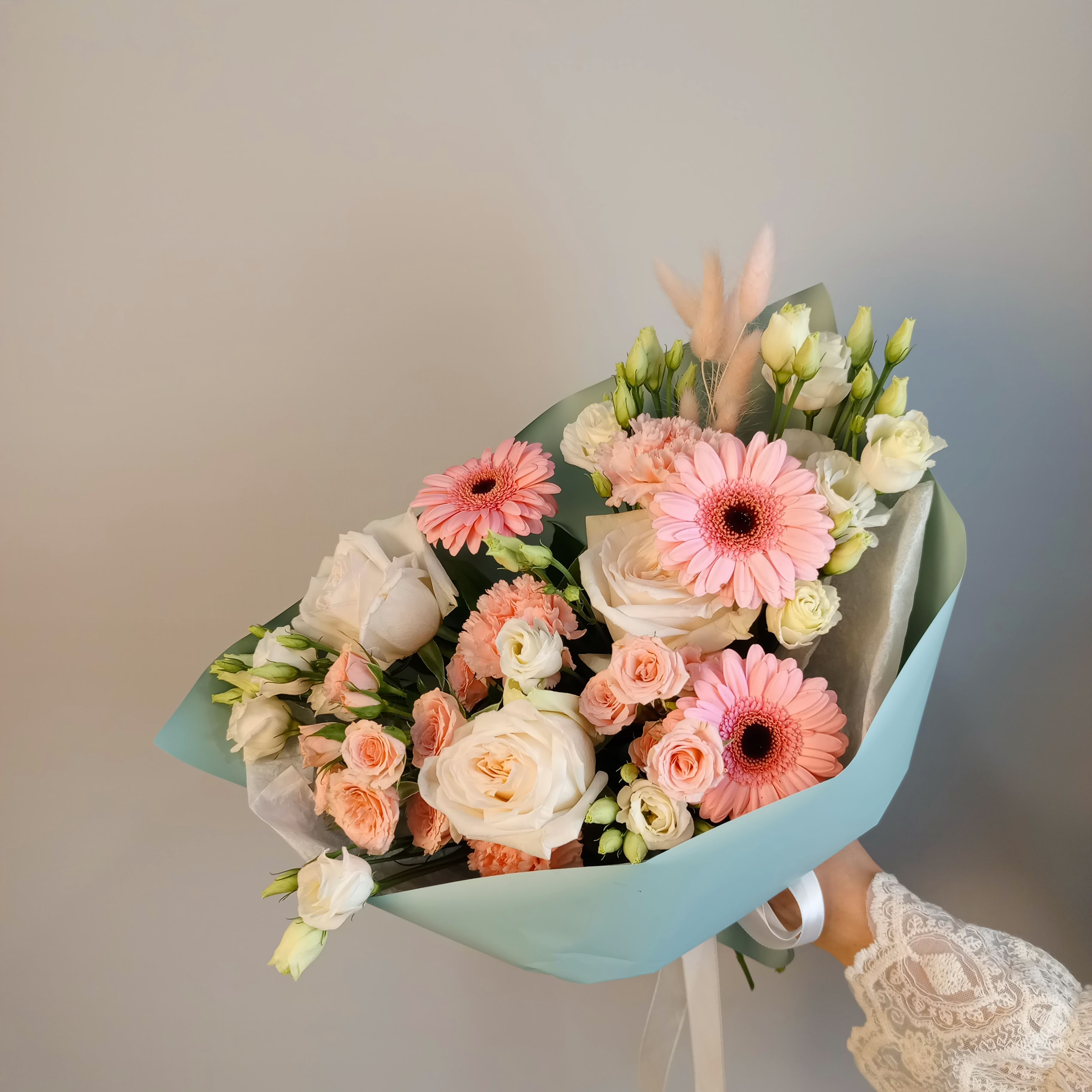 гермини 3шт,роза кустовая 2шт, диантус 3шт, лагурус 7шт, эустома 2шт, роза White O’Hara 3штДополнительно