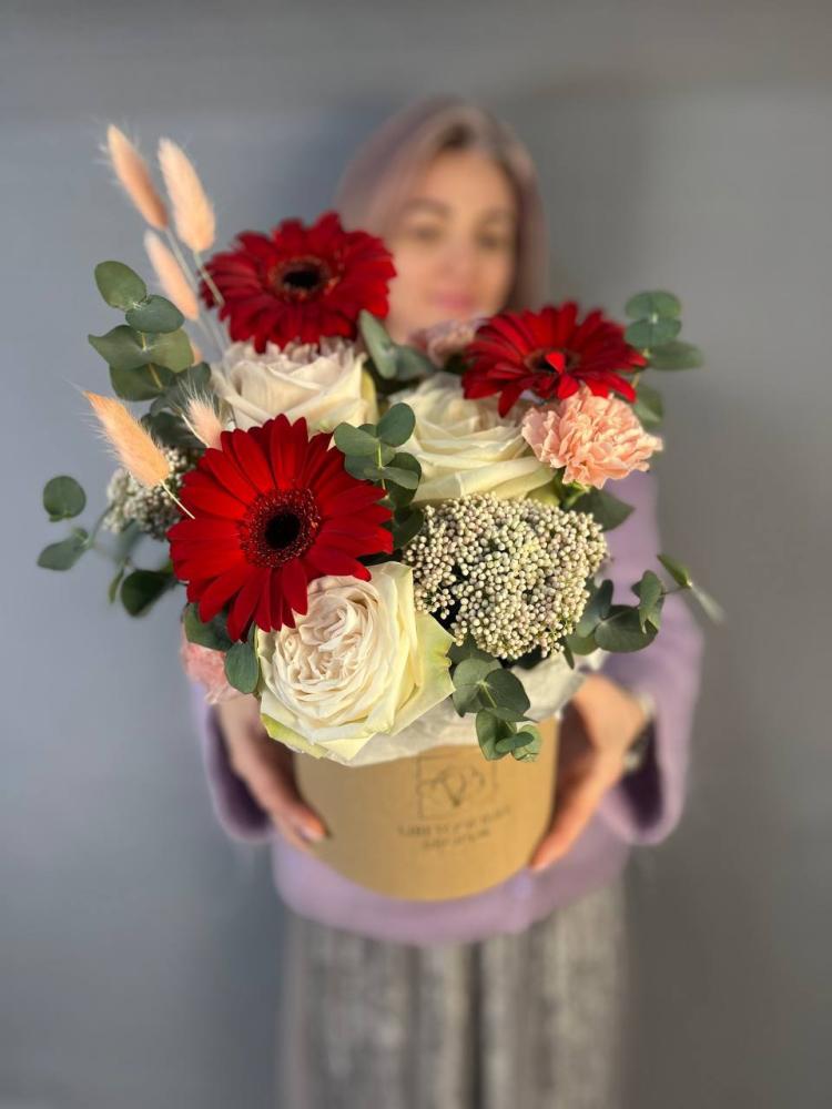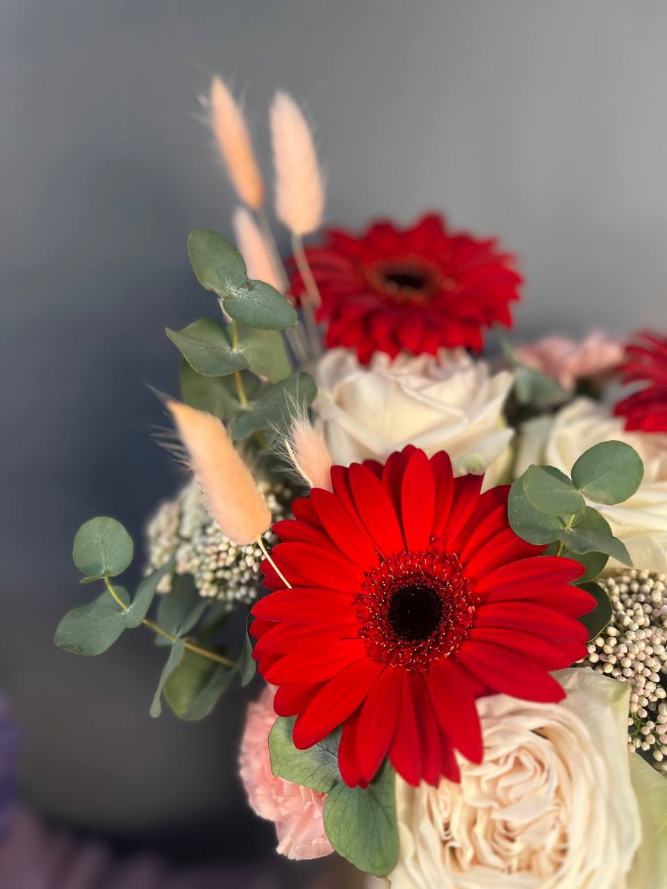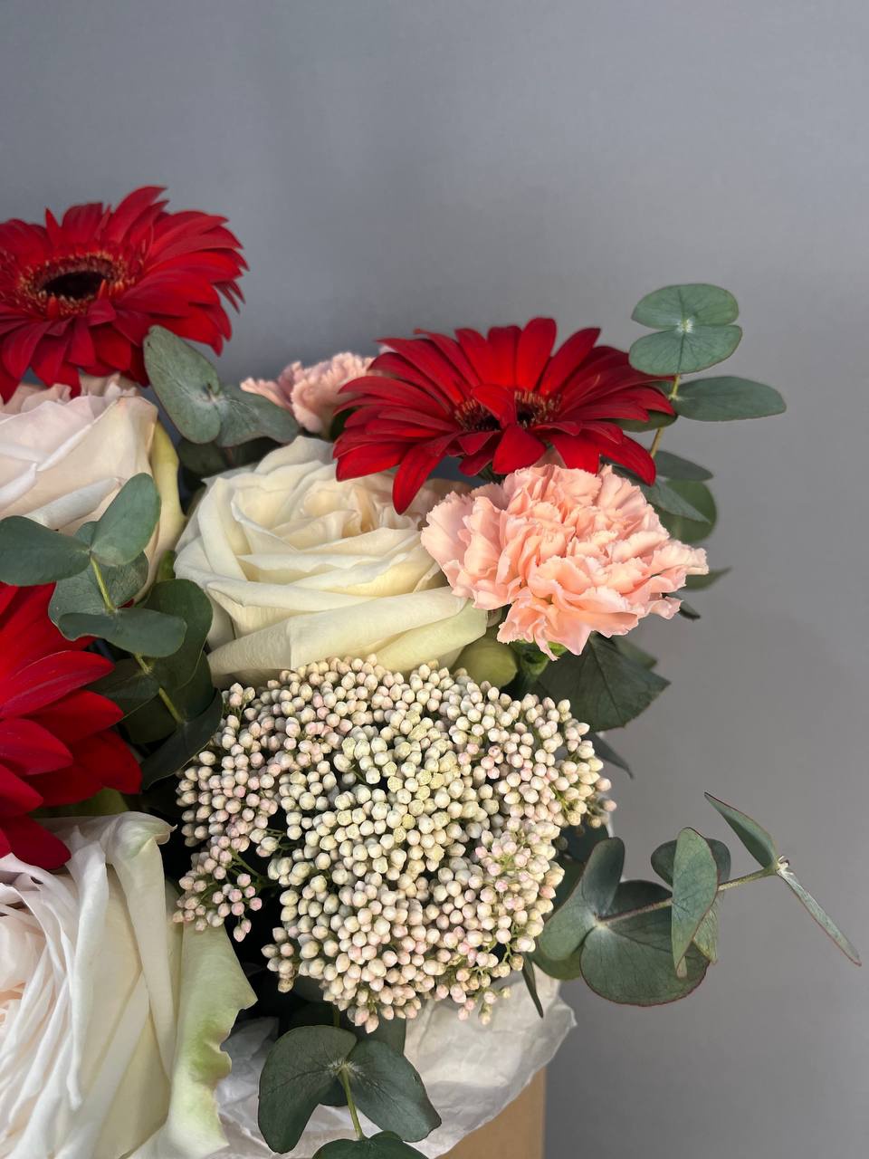 геребера 3шт, лагурус 5шт, роза White O’Hara 3 шт,озотамнус 1шт,эвкалипт 1Дополнительно