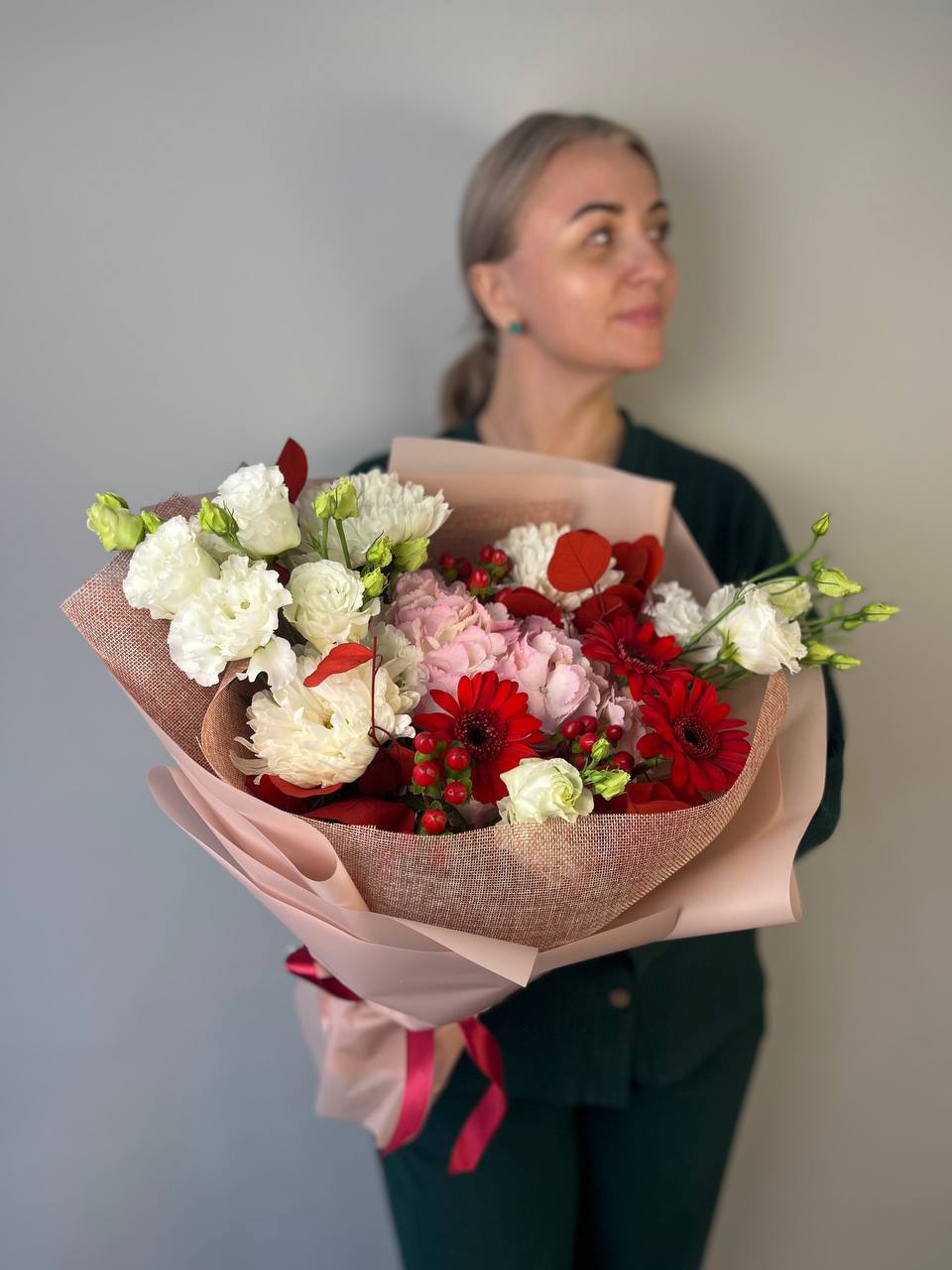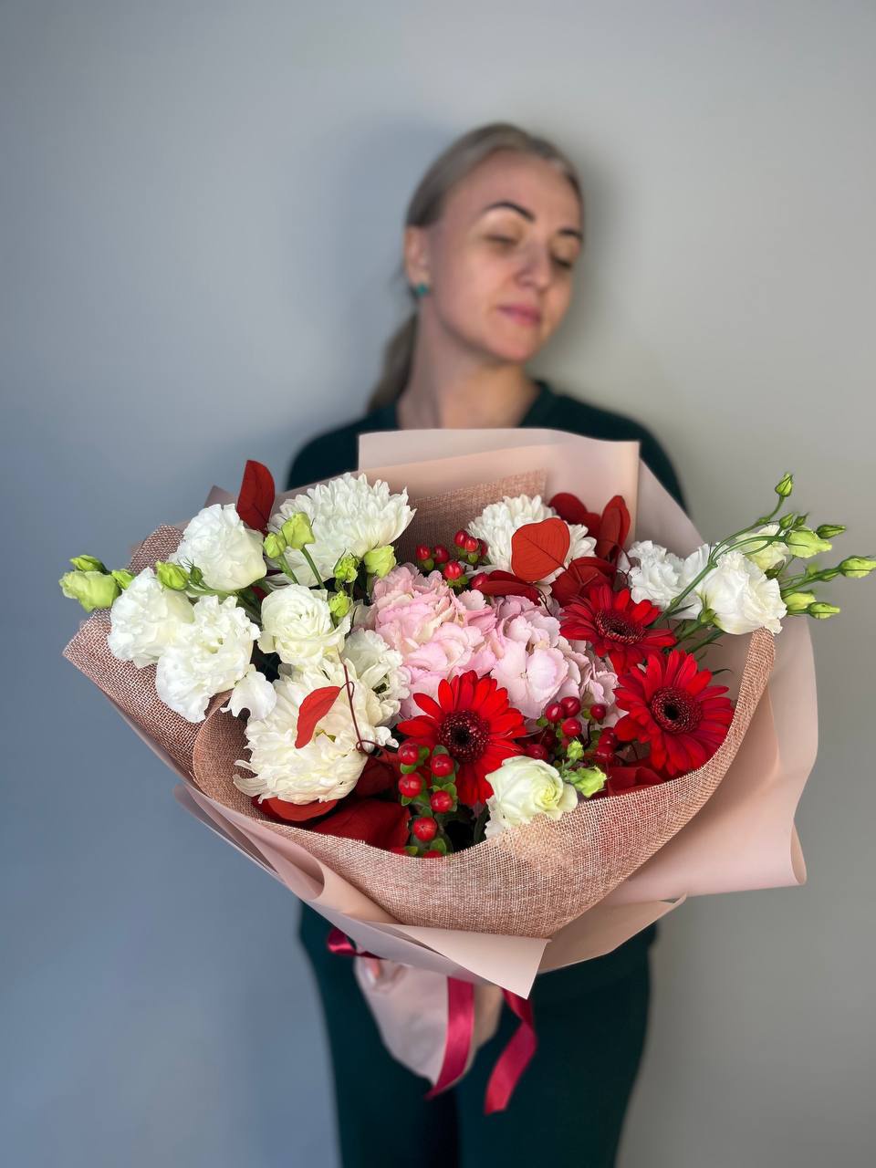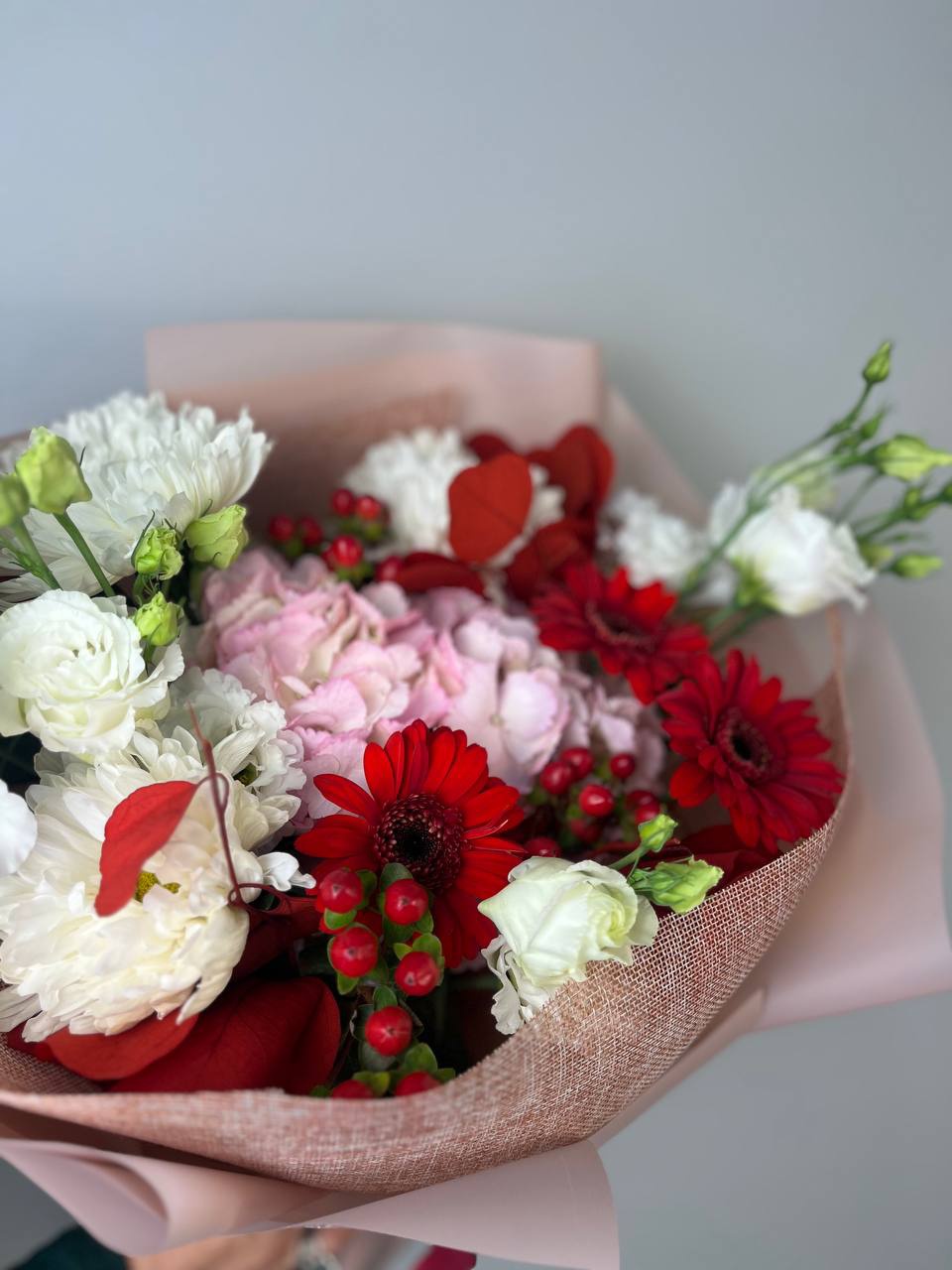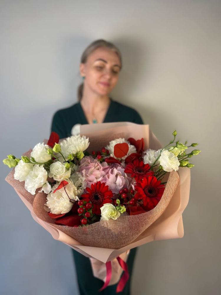 Гермини красные 3шт, гортензия розовая 1шт, гиперикум 2шт, эвкалипт крашенный 2шт, эустома белая 2шт