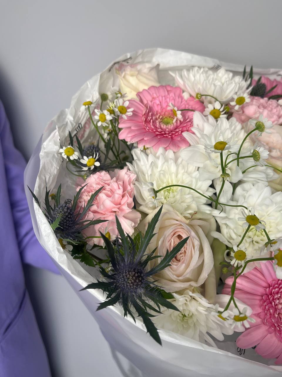 эрингиум 2шт,хризантема кустовая 3шт, гермини 3шт, диантус 3шт, роза эквадор 3шт, танацетум 3шт,Дополнительно