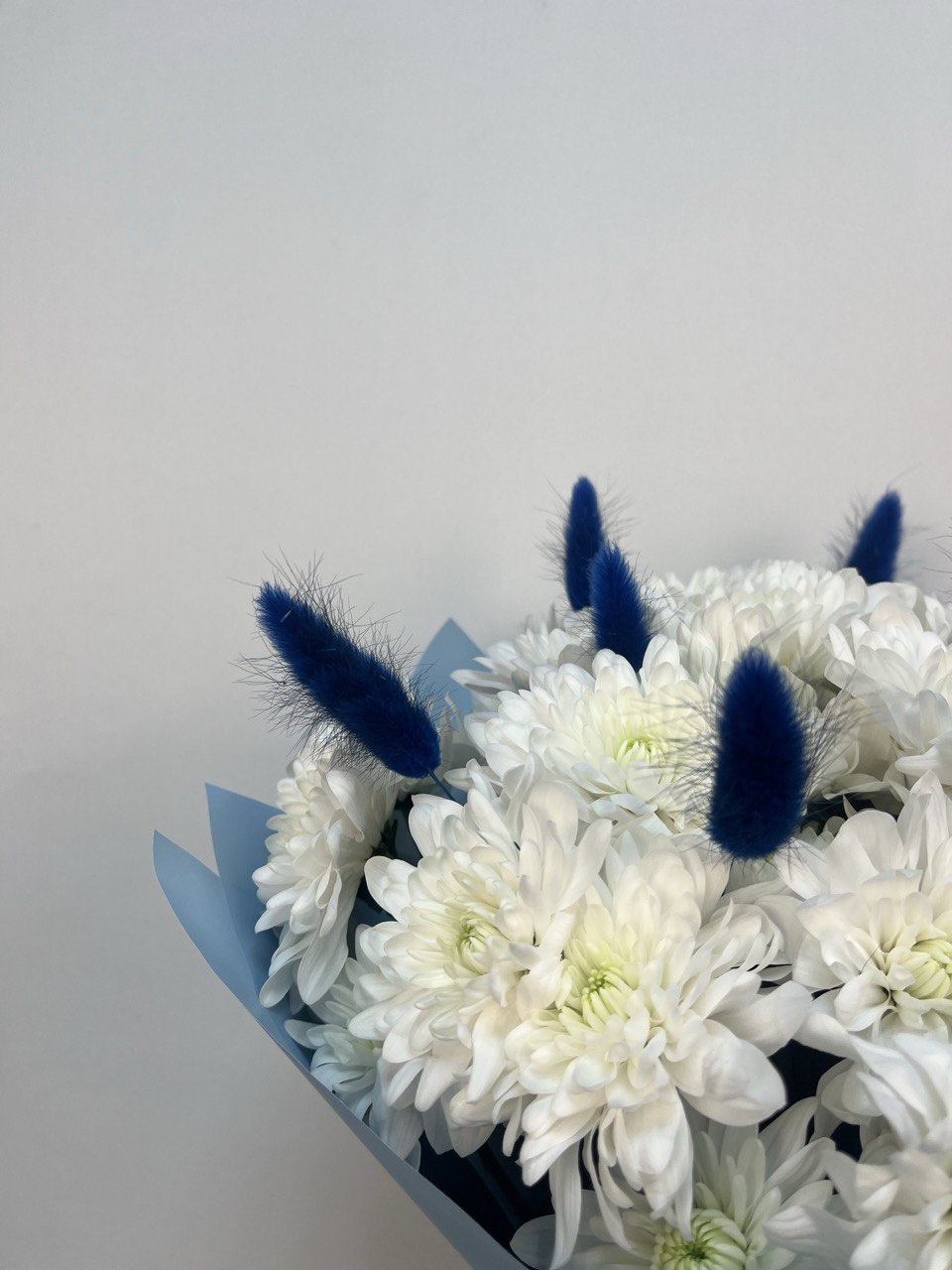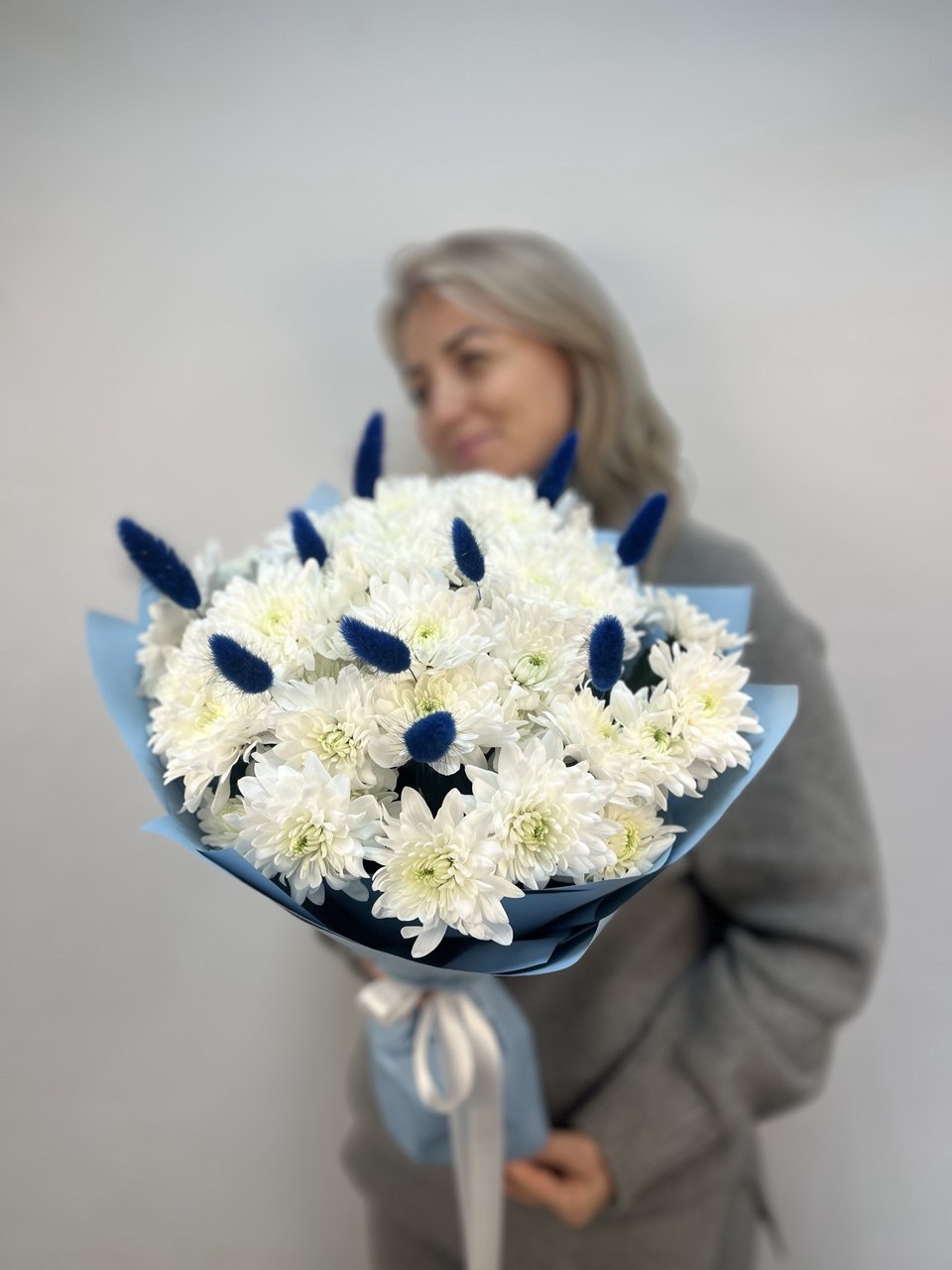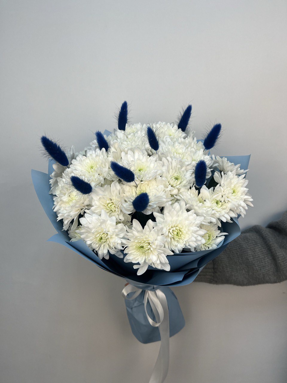 хризантема 7шт, лагурус 13шт, упаковка дизайнерская 2шт, лента атласная 1штДополнительно
